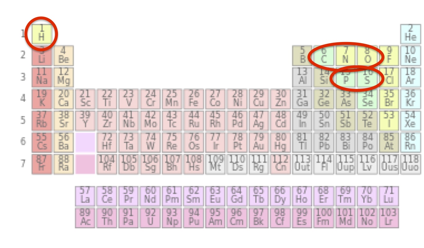 - The periodic table categorizes more than 100 elements. Although around 25 types of elements can be found in biomolecules, only six elements are most common. These are carbon, hydrogen, nitrogen, oxygen, phosphorus, and sulfur. Few metals are used by nature, although iron, zinc, and manganese are essential in various ways.